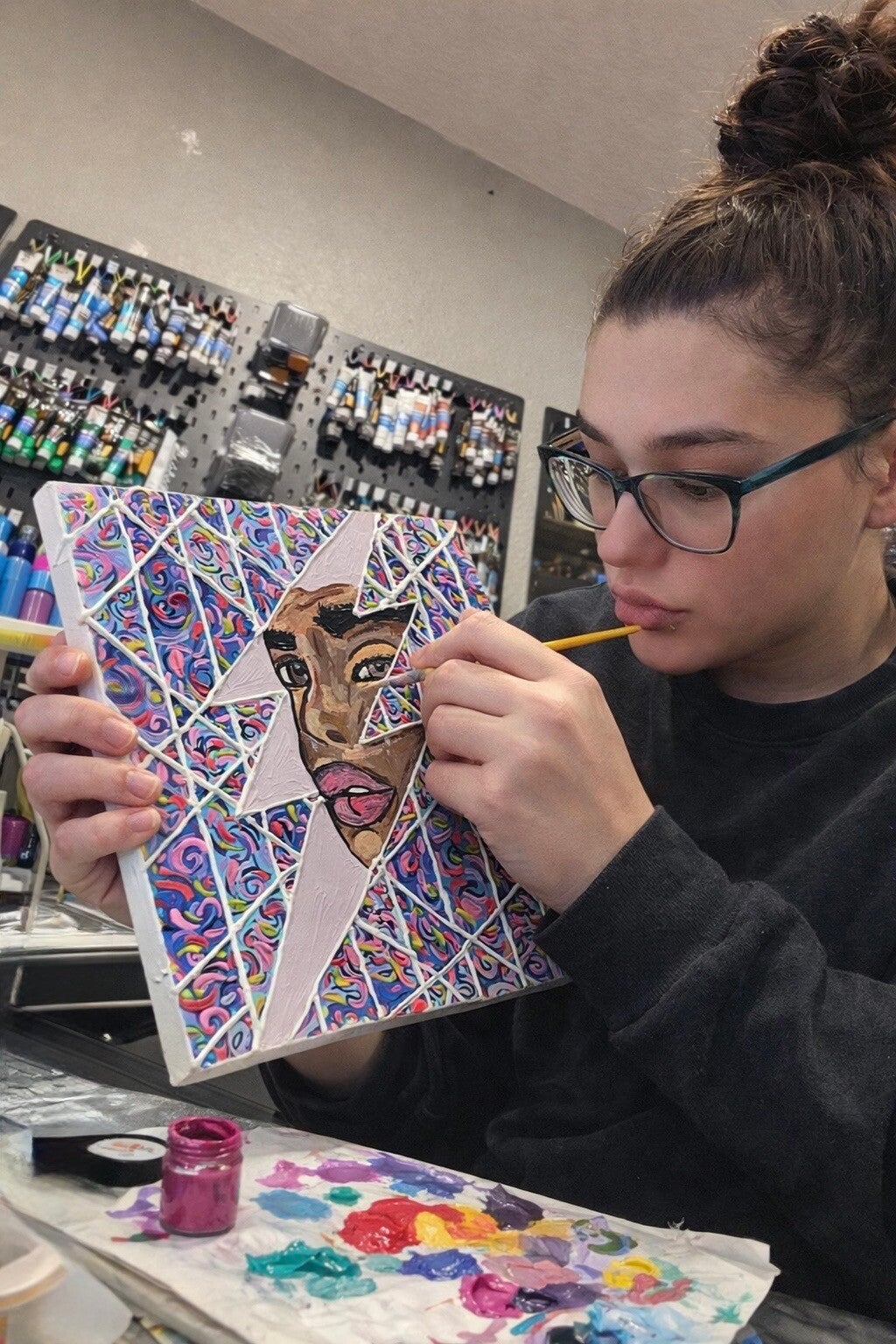 My abstract style reflects lived experience — fragmentation, tension, softness layered over fracture. You’ll often see subtle gold lines in my work. They symbolize rebuilding. Not hiding the cracks, but honoring them.